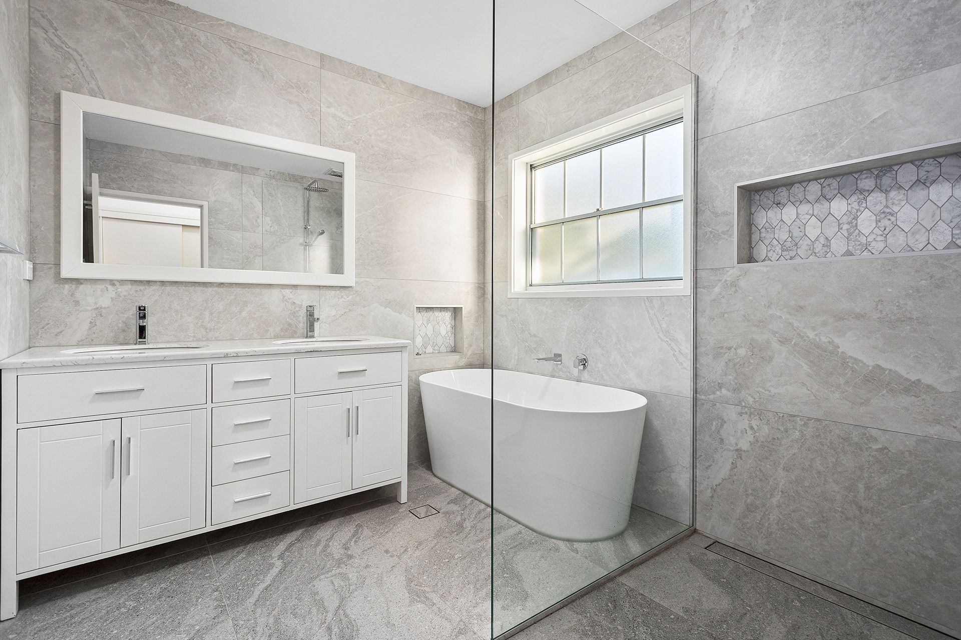 • Stylish main bathroom featuring a freestanding bath, double vanity, porcelain tiles, and extra storage